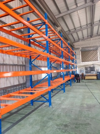 四層重型料架,可以依業主需求調整。每層高度可以均高或是不同高度。使用本公司的堆高機直接將貨物推送上最高層。方便儲放、取用。